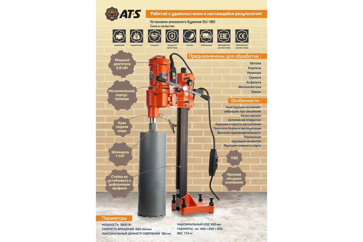 SU-180 самая простая из профессиональных бурильных установок AT-S, предназначенная для бурения отверстий в бетоне, камне, кирпиче на строительных площадках. Используется с алмазными коронками до Ø180 мм. Стандартный диаметр шпинделя 1 1/4". Установка алмазного бурения оснащена защитой от перегрузки, есть функция плавного старта и управления крутящим моментом. Надежный мощный и производительный двигатель в металлическом корпусе. Все комплектующие сделаны из высококачественных материалов.